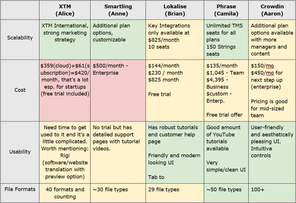 This project was engaging and dynamic, giving us the opportunity to collaboratively research, analyze, evaluate, compare, and discuss some of the most popular and competitive Translation Management Systems on the market today. We look forward to continuing to observe changes and technological advancements in these systems as well as the emergence of new ones. In the future, we will be even better prepared to advise the companies we work with on the most efficient ways to achieve their localization goals.