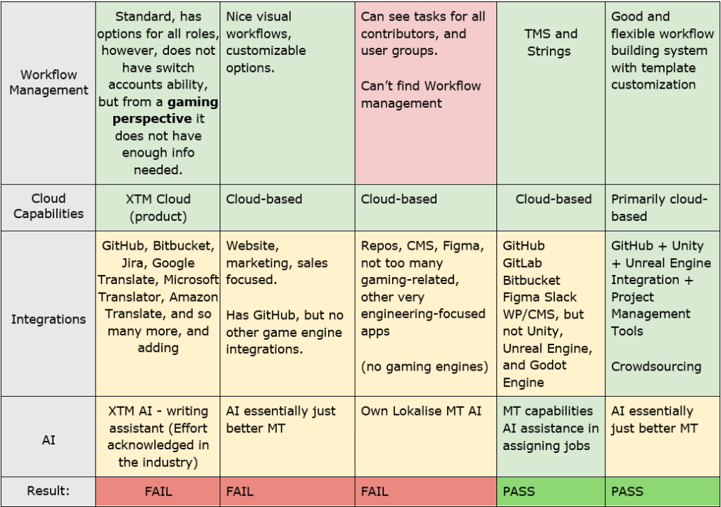 For this project, we researched, evaluated, and compared five different Translation Management Systems to recommend the most suitable one for a midsize game localization company. Our consultation took into account all critical factors necessary to achieve the company’s business goals, including the capability to localize their primary product into at least five locales. For our research and comparison, we evaluated five well-known management systems: